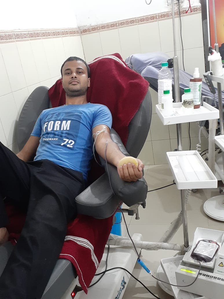 सदर अस्पताल बल्ड बैंक में रक्तदान करते रक्तवीर साकेत राज