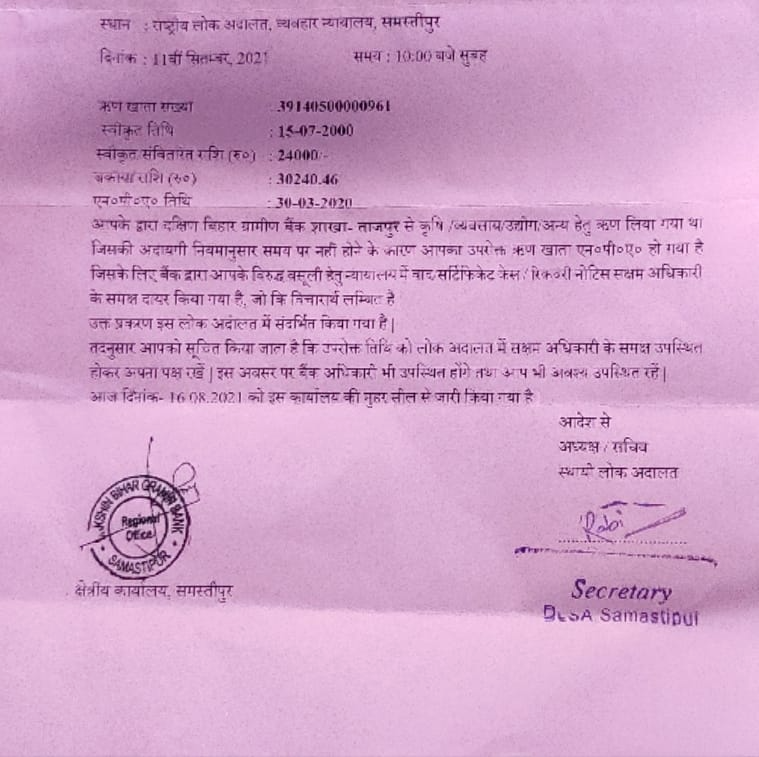 ताजपुर/समस्त्तीपुुर ( जनक्रांति हिन्दी न्यूज बुलेटिन कार्यालय 29 अगस्त 2021)। उत्तर बिहार ग्रामीण बैंक सहित अन्य बैंकों द्वारा किसानों को लोन अदायगी के लिए धराधर नोटिस भेजा जा रहा है। इसमें बैंक द्वारा वसूली हेतु न्यायालय में वाद/सर्टिफिकेट केस//रिकवरी नोटिस सक्षम अधिकारी के समक्ष दायर किया गया है जहां 11 सितंबर 2021 को उपस्थित होने को कहा गया है। परिस्थिति के मारे बेहाल किसान को कुछ समझ में ही नहीं आ रहा है, क्या करें और क्या न करें।