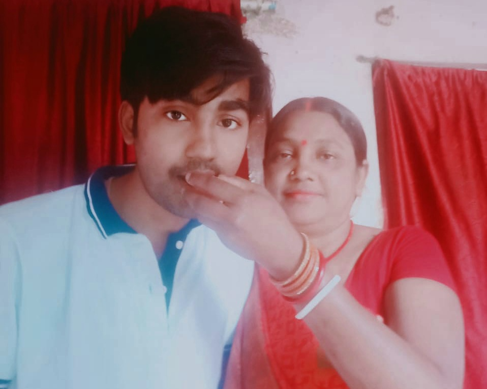 छात्र अभिजीत भूषण की मां प्रफुल्लित भाव से अपने लड़के को खिलाई मिठाई दी बधाई